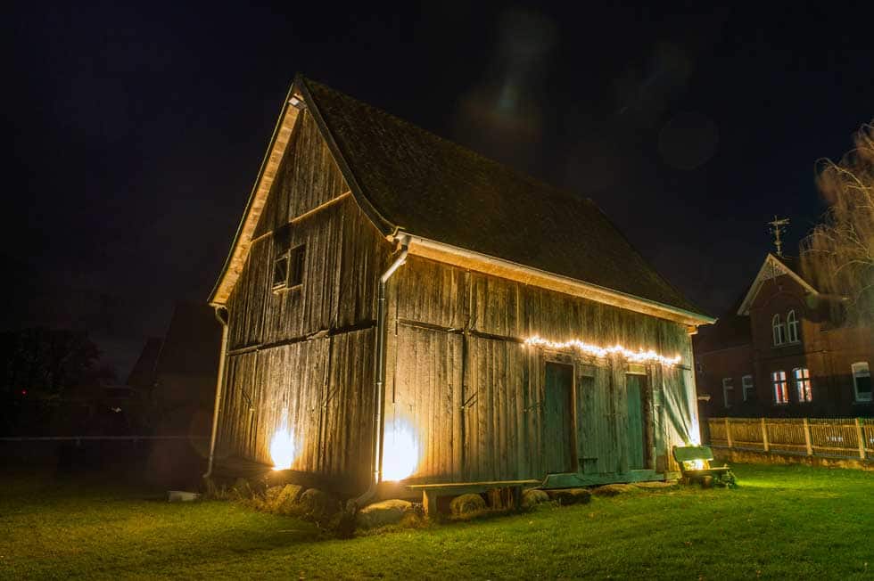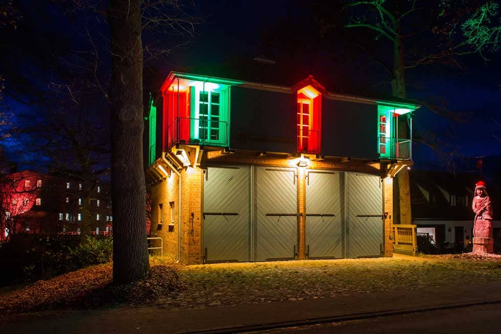 Der Veranstaltungsprofi, der sonst z.B. beim Mühlenfest für die Bühne, den Sound und das Licht sorgt, beleuchtet im Auftrag der Bohlsener Mühle das Feuerwehrhaus, den historischen Speicher und die Bohlsener Mühle selbst.