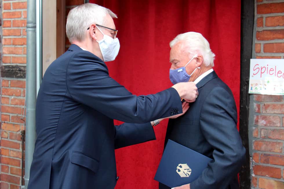 Unter Berücksichtigung der Corona-Regeln heftet Landrat Dr. Heiko Blume (l.) Claus-Dieter Reese den Verdienstorden 1. Klasse ans Revers