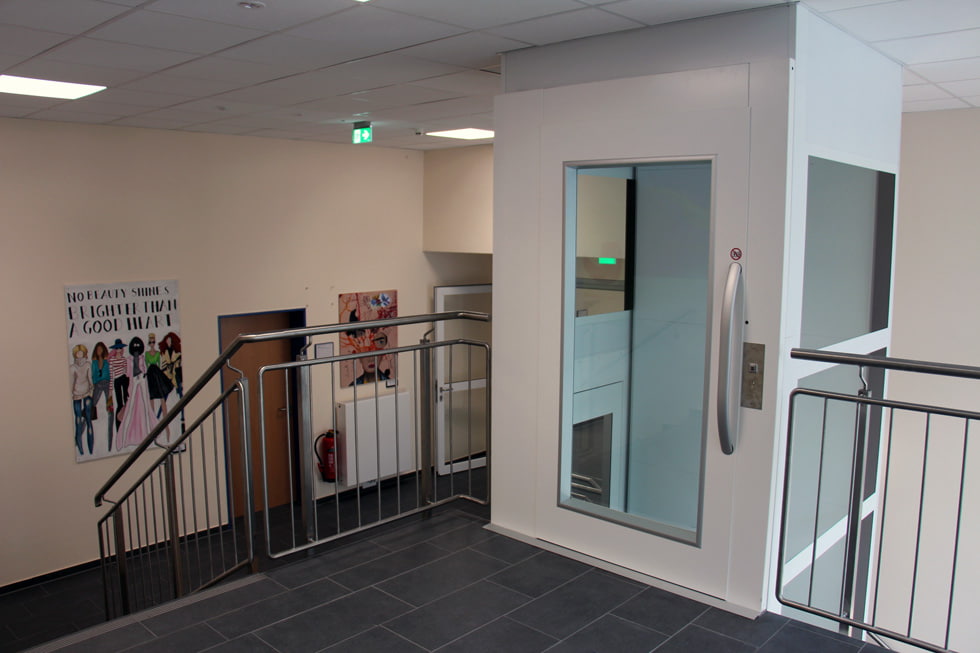 Ein Fahrstuhl ermöglich den barrierefreien Zugang zu den Klassenräumen im 1. Obergeschoss sowie der Tribüne der Turnhalle