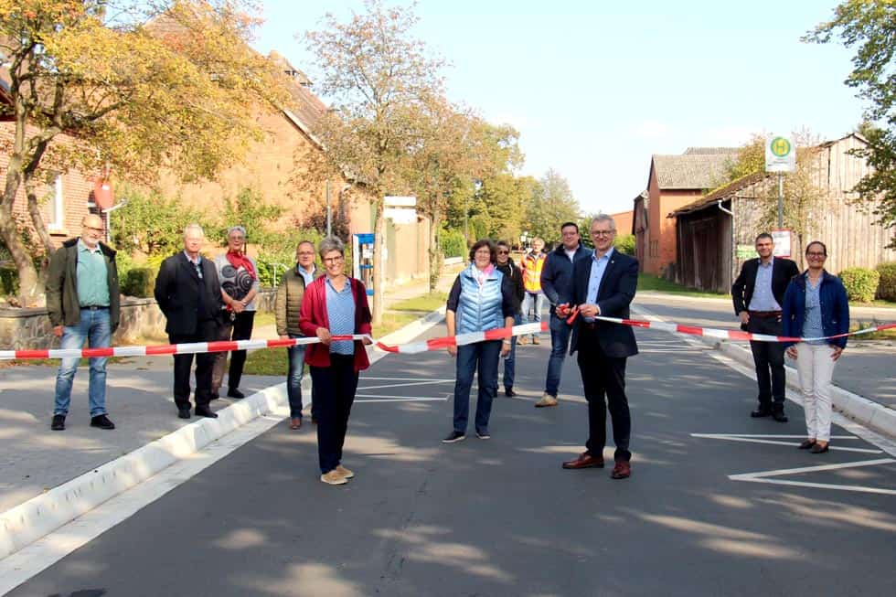 Im Beisein einiger Dorfbewohner, kommunalpolitischer Vertreter, verantwortlicher Verwaltungsmitarbeiter und des bauausführenden Unternehmens Siebenbrodt durchtrennte er mit einem kräftigen Scherenschnitt ein kurz zuvor angebrachtes Absperrband.