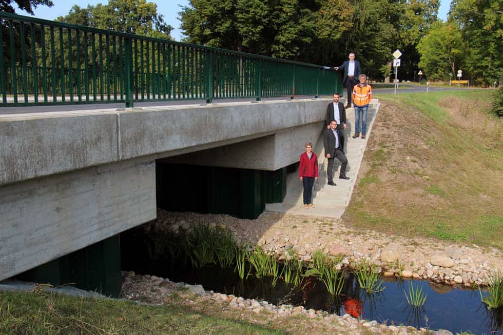 Landrat Dr. Heiko Blume (von oben nach unten), Axel Hinrichs (Amt für Kreisstraßen), Paul Herzig (von der Fa. Siemke & Co.), Bau- und Umweltdezernent Tobias Linke sowie Stefanie Lotz (Leiterin des Amtes für Kreisstraßen) besichtigen die neue Brücke in Hamerstorf