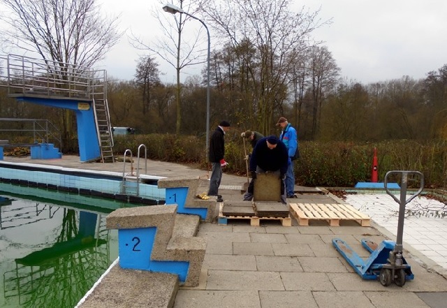 Auf der so genannten "Startblockseite" seien uneben gewordene Gehwegplatten aufgenommen worden. Mit neuem Verbundpflaster hätten Helfer anschließend die Höhe des Weges an die Höhe der Beckenumrandung angepasst.