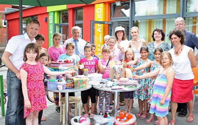 Die Mädchen und Jungen freuen sich riesig: Voller Neugier betrachten sie die neuen Bastelmaterialien für den Kindertreff am Königsberg.