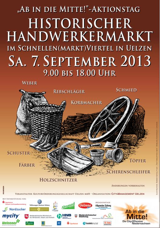 Sonnabend, der 7.September, ist der landesweite Aktionstag der Preisträger-Kommunen des Landeswettbewerbs "Ab in die Mitte 2013". Uelzen stellt sich an diesem Tag mit einem historischen Handwerkermarkt im Schnellenmarktviertel vor und lädt alle Bürger herzlich dazu ein. Von 9 bis 18 Uhr lebt die Tradition des alten Viertels zwischen der Heilig-Geist-Kapelle und, je nach Fortschritt der Bauarbeiten, bis zum Brunnen am Schnellenmarkt wieder auf.