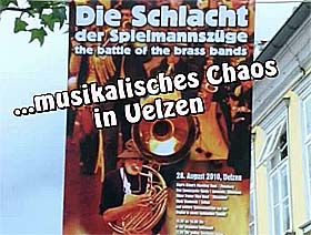 8 Brass Bands und Spielmannszüge, von traditionell bis amerikanisiert, lokal wie auch auswärtig, ziehen kreuz und quer durch Uelzens Innenstadt. Sie spielen laut und von weitem hörbar, sie nähern sich, sie ziehen vorbei - alter Marsch trifft auf Samba, amerikanischer Blues kollidiert mit schottischen Dudelsäcken. Sie treffen früher oder später aufeinander, üben sich in Witz und sich gegenseitig überbietender Lautstärke, um kurz darauf wieder in verschiedene Richtungen abzuziehen.