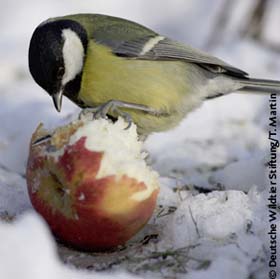 Die Deutsche Wildtier Stiftung rät Vogelfreunden, den Tisch für alle daheimgebliebenen Vögel mit Überlegung zu decken. „Dabei sollte man berücksichtigen, dass nicht alle Vögel dasselbe futtern“, sagt Eva Goris. Die Expertin empfiehlt, bei der Vogelfütterung nicht nur an die Körnerfresser zu denken. Weichfresser wie Amseln, Singdrosseln und Rotkehlchen schätzen getrocknete Beeren vom Holunder oder der Eberesche, sie lieben Hagebutten und kleingeschnittene Äpfel und Birnen. Körnerfresser wie Finken, Spatzen und der Zeisig sind mit kleingehackten Hasel- und Walnüssen, Bucheckern und den Fruchtständen von Hirse und Mohn zu beglücken. „Wer abwechslungsreich füttert, bereitet den Vögeln zum Fest eine wirklich schöne Bescherung.“