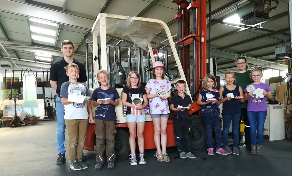 Insgesamt acht Kinder im Alter von sechs bis zehn Jahren hatten die Möglichkeit, die Lagerhalle, die verschiedenen Glasbearbeitungsmaschinen sowie den Gabelstapler des Meisterbetriebes genauer unter die Lupe zu nehmen.