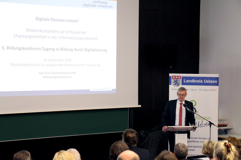 In diesem Zusammenhang kämen sowohl auf das Land Niedersachsen als auch auf den Landkreis als Träger der weiterführenden Schulen viele Aufgaben zu. Dies betreffe, so Blume weiter, aber nicht nur die erforderliche Infrastruktur, sondern auch sehr viele inhaltliche Aspekte, denen man sich im Rahmen der Konferenz nähern wolle. Diesbezüglich seien letztlich insbesondere Lehrerinnen und Lehrer gefragt. "Wir wollen, was das Thema Bildung und Digitalisierung betrifft, nichts überstürzen oder übertreiben, aber wir können und wollen die derzeitigen Entwicklungen auf diesem Gebiet auch nicht ignorieren", wies Blume auch auf aktuelle Pläne und Aktivitäten des Bundes, des Landes Niedersachsen und der Europäischen Union hin. Abschließend warnte der Uelzener Landrat vor einer „digitalen Spaltung“ der Gesellschaft, die es unbedingt zu vermeiden gelte. Insofern müssten künftig nicht nur die Jüngeren von den Älteren lernen, sondern auch die Älteren von den Jüngeren.