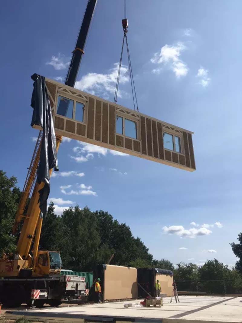 Die ersten Wände aus Holz und Stroh stehen bereits auf der Bodenplatte.