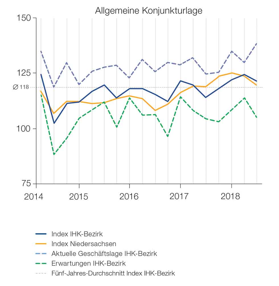Die regionale Wirtschaft im Bezirk der Industrie- und Handelskammer (IHK) Lüneburg-Wolfsburg trotzt dem wachsenden Konjunkturpessimismus: Laut aktueller IHK-Umfrage bewerten 44 Prozent der befragten Betriebe ihre aktuelle Geschäftslage als gut, 50 Prozent als befriedigend, nur sechs Prozent fällen das Urteil "schlecht". Der Konjunkturklimaindex erreicht mit 121 Punkten ein ausgezeichnetes Ergebnis, ist im Vergleich zum Vorquartal allerdings um drei Punkte gesunken. Grund ist, dass viele Unsicherheitsfaktoren auf die Zukunftserwartungen drücken, während die aktuelle Wirtschaftslage auf das höchste Niveau seit Ende 2011 gestiegen ist.