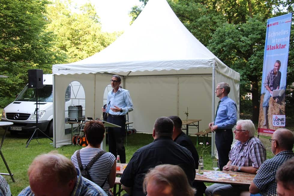 Unter den rund 250 Gästen der durch den Landkreis und das Telekommunikationsunternehmen "LüneCom" gemeinsam ausgerichteten Feier dankte Blume insbesondere den zahlreichen Multiplikatorinnen und Multiplikatoren, die während der Vorvermarktungsphase von Haustür zu Haustür gegangen waren, um persönlich für den Abschluss eines entsprechenden Vorvertrages zu werben. In seine Dankesworte schloss der Landrat aber ebenso auch alle Ortsvorsteher, Bürgermeister, Samtgemeindebürgermeister, die Mitglieder der einzelnen Gemeinderäte, die Kreistagsabgeordneten, die heimischen Bundes- und Landtagsabgeordneten und nicht zuletzt alle Vertriebspartner ein, die sich alle unglaublich für das Projekt ins Zeug gelegt hätten.
