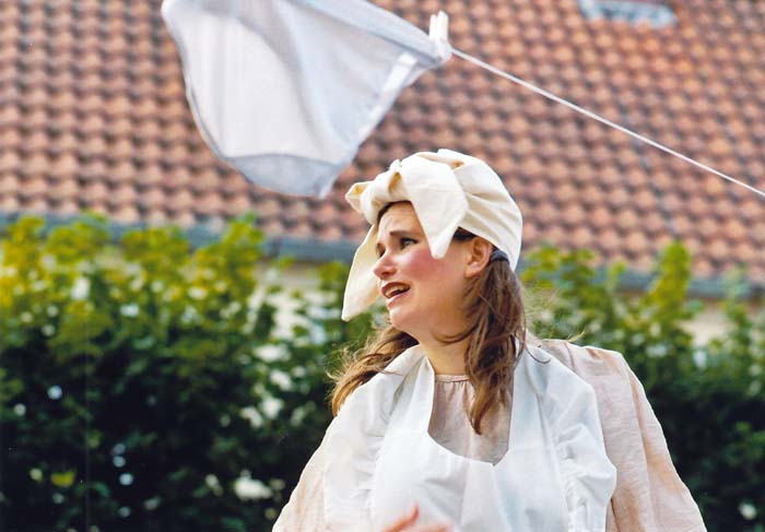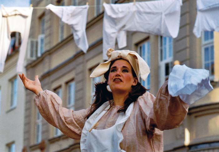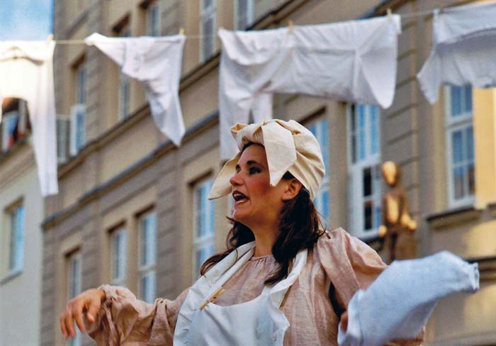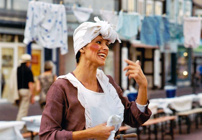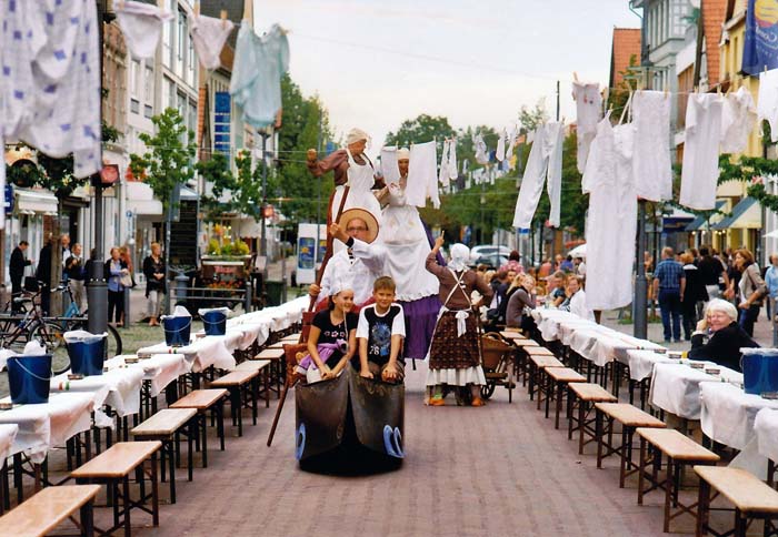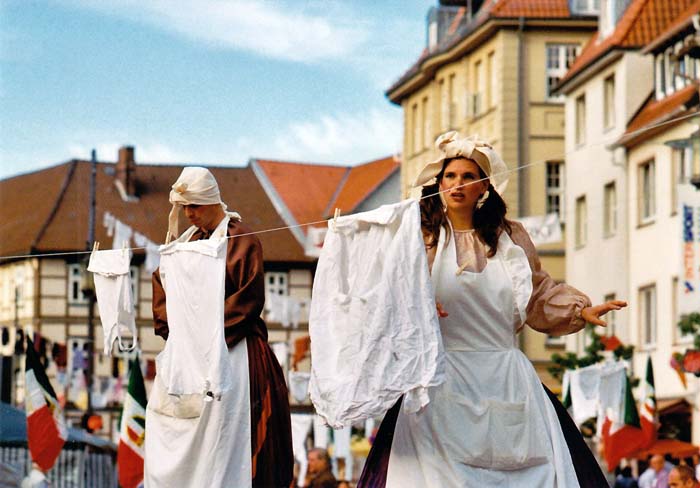 Insgesamt 1500 Wäschestücke wurden auf die Leinen gehängt und je länger die Darsteller des Stelzentheater in München die Zuschauer animierten dabei zu helfen, desto lockerer wurde auch das Verhältnis der Uelzener zu riesengroßen Feinripp-Unterhosen.
