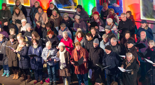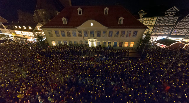 Stille und ein Meer aus Lichtern in den Marktstraßen: Zum Abschluss des Uelzener Adventskalenders haben tausende vor dem Alten Rathaus, wie Bürgermeister Jürgen Markwardt es nannte, ein "beeindruckendes Zeichen für Menschlichkeit" gesetzt. Frauen, Männer und Kinder hielten kleine Leuchten in die Höhe, schwiegen, bevor Chorsänger auf der großen Bühne das Werk "Über dunklen Feldern" anstimmten. Es war der emotionale Höhepunkt beim öffnen des letzten Fensters, zu dem auch wieder Ministerpräsident Stephan Weil in der Stadt begrüßt werden konnte.